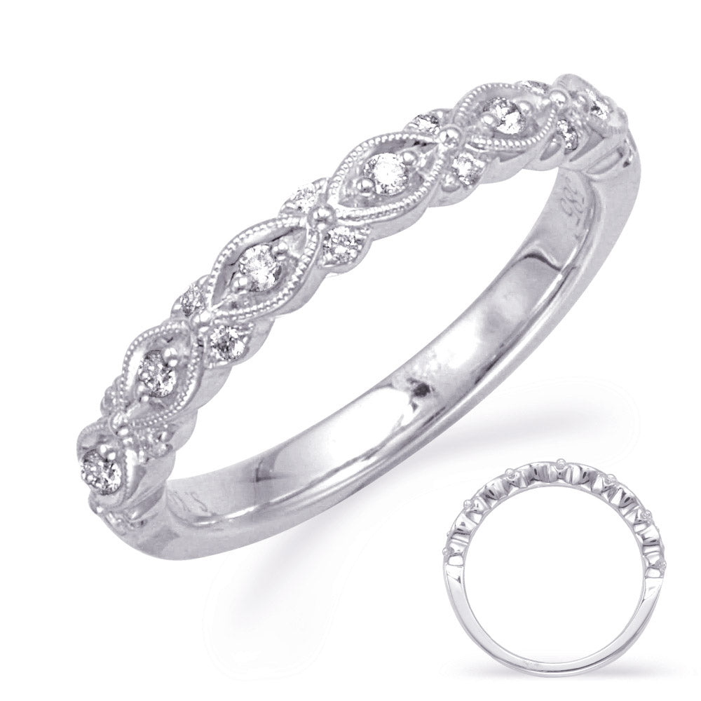 This Band is available in 14K White Gold. There are a total of 20 stones. There are Round with a total carat weight of 0.18 set in a Channel Set|Prong Set setting.