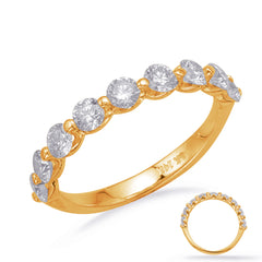 This Band is available in 14K Yellow Gold. There are a total of 9 stones. There are Round with a total carat weight of 1.1 set in a setting.