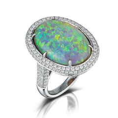 18kt white gold ring, Australian Opal oval (14.5x20.11mm), N/S set, surrounded by 200 H/I SI pave diamonds