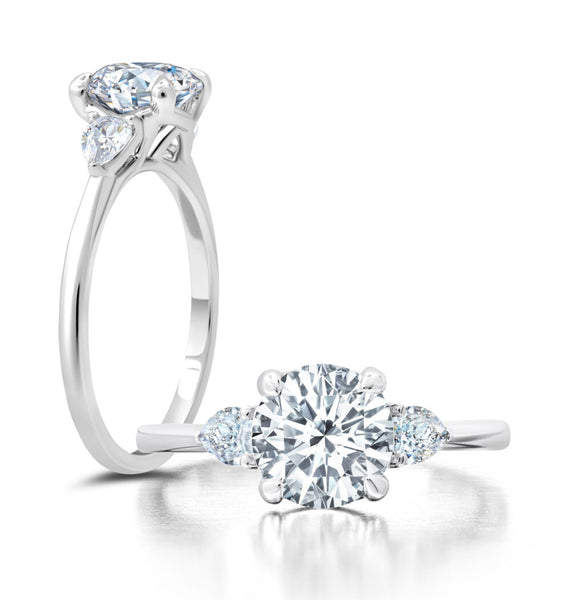 A classic twist on a three stone ring, this ring features two pear shape diamonds sitting on either side of your chosen center. Great for any shape center stone.
