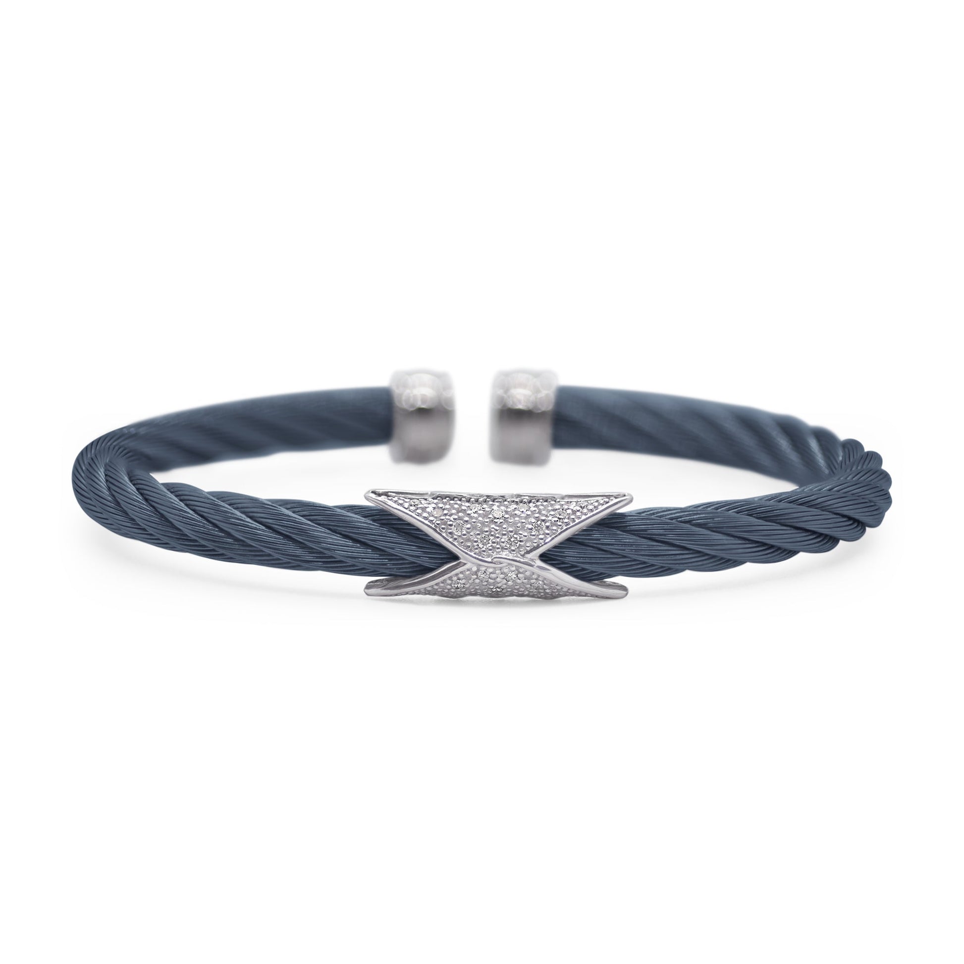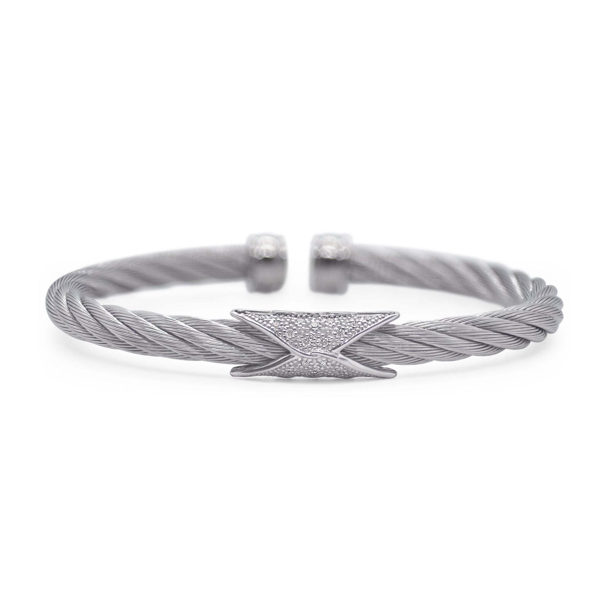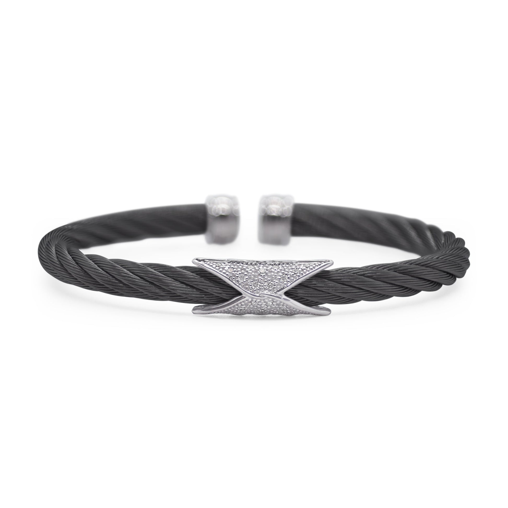 A wide 5mm cable cuff with a center hourglass station made of diamonds.
