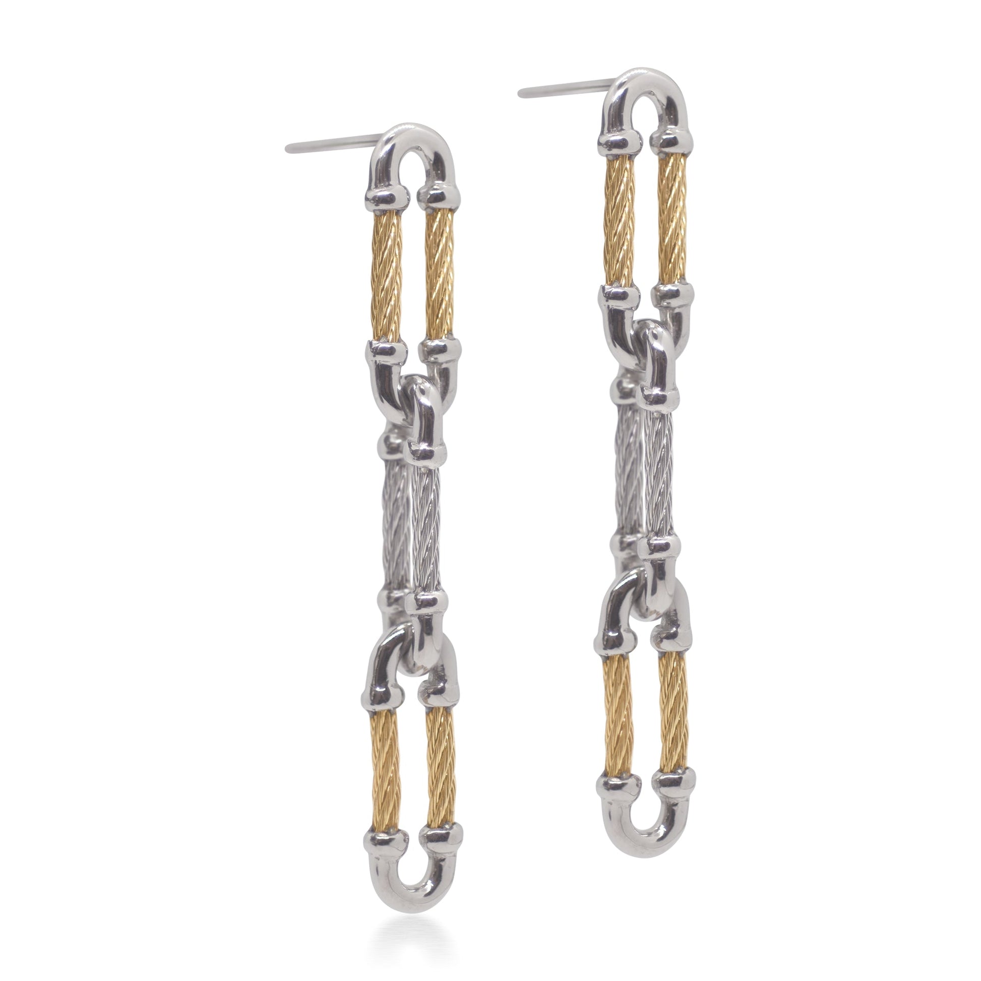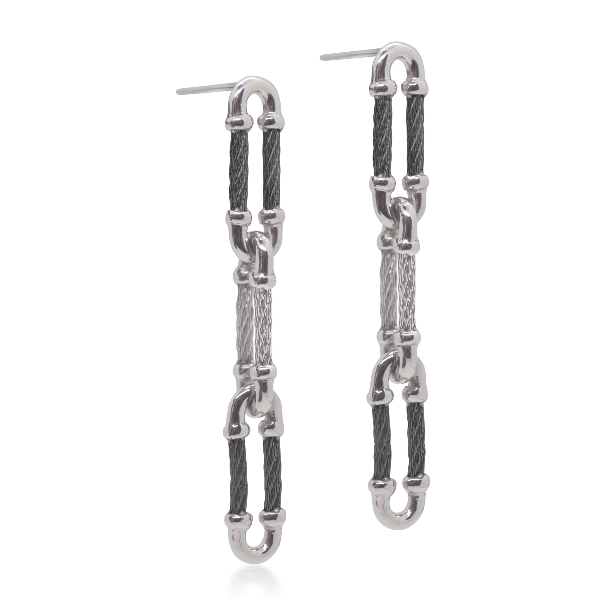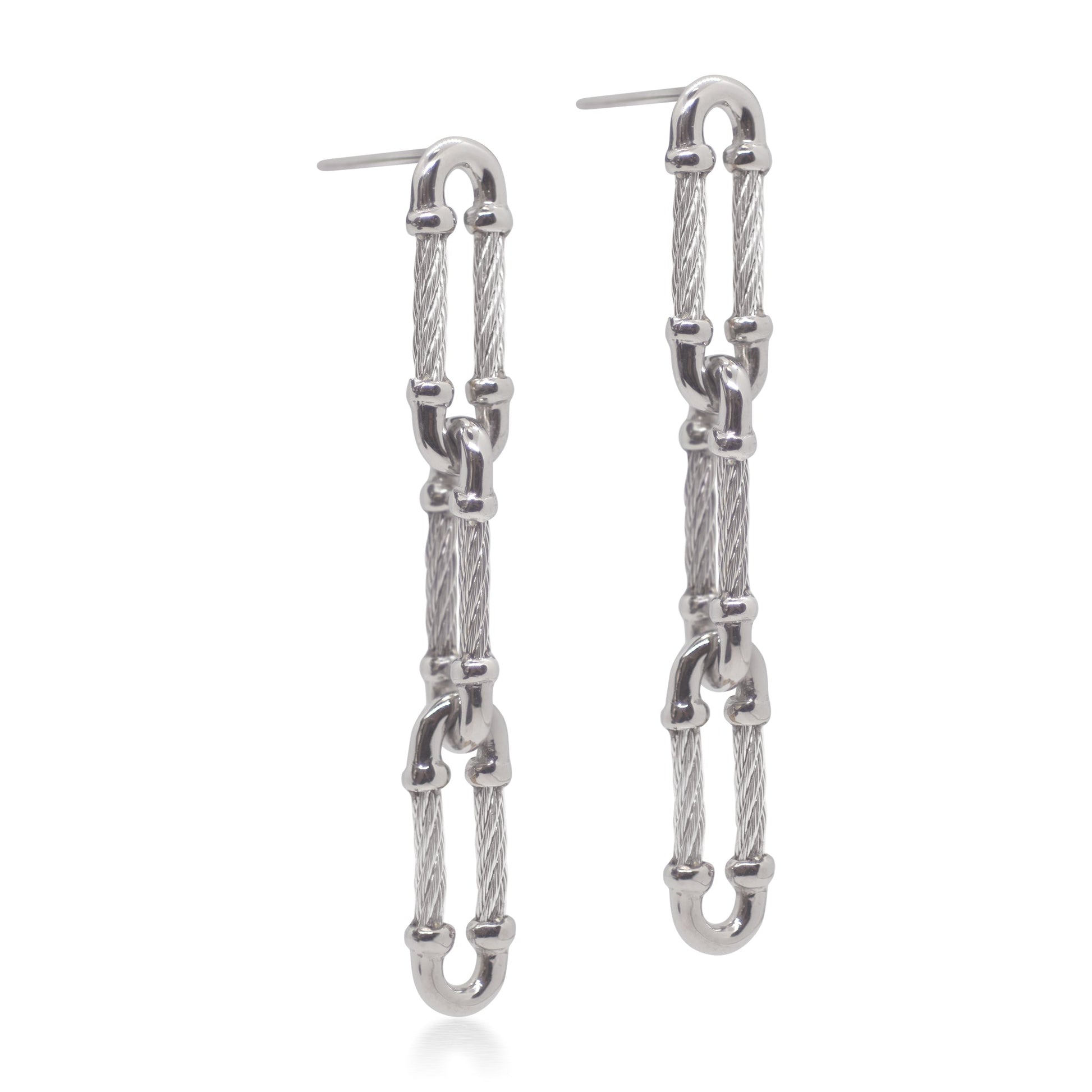 A paperclip design of drop earrings made of cable and steel endcaps.