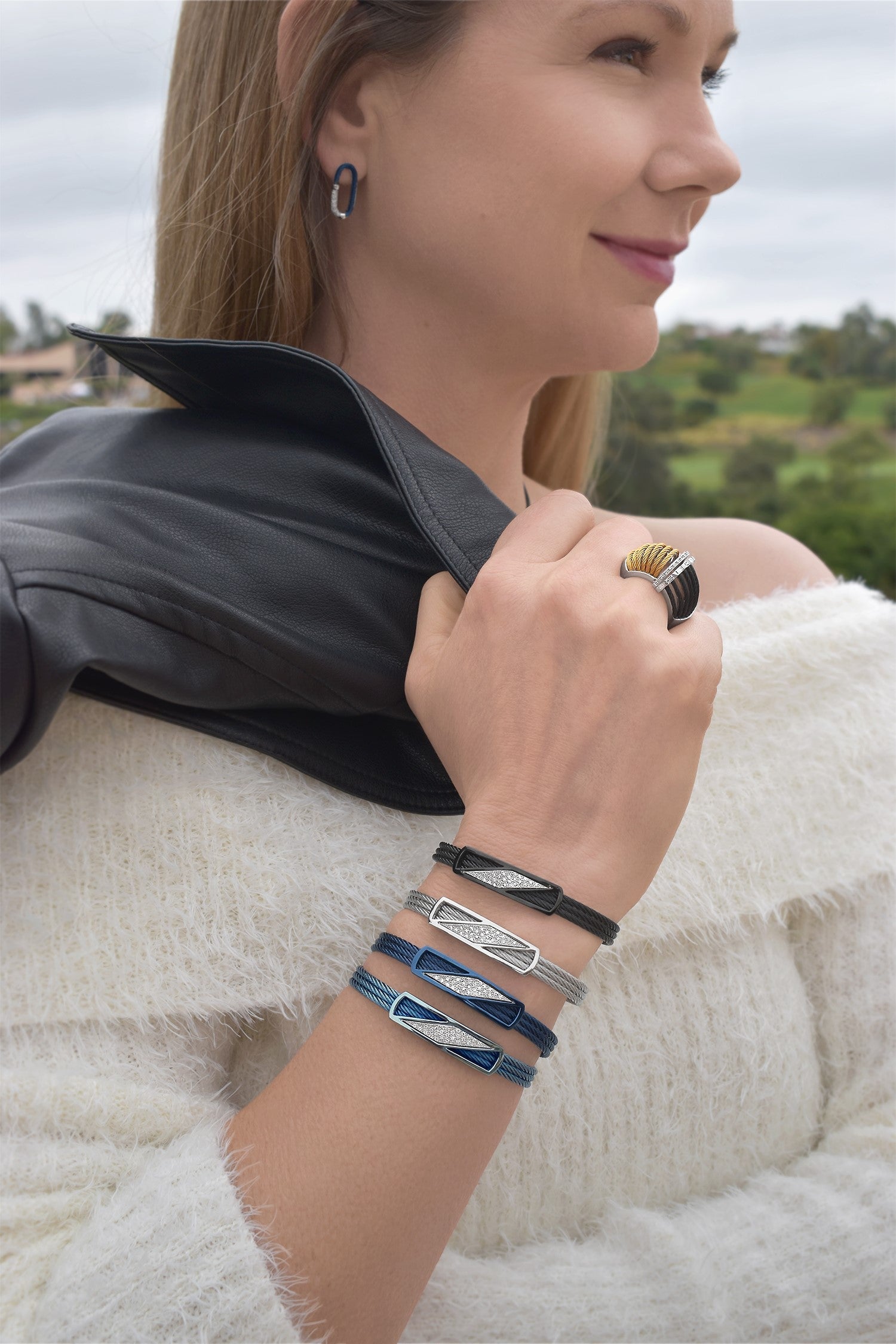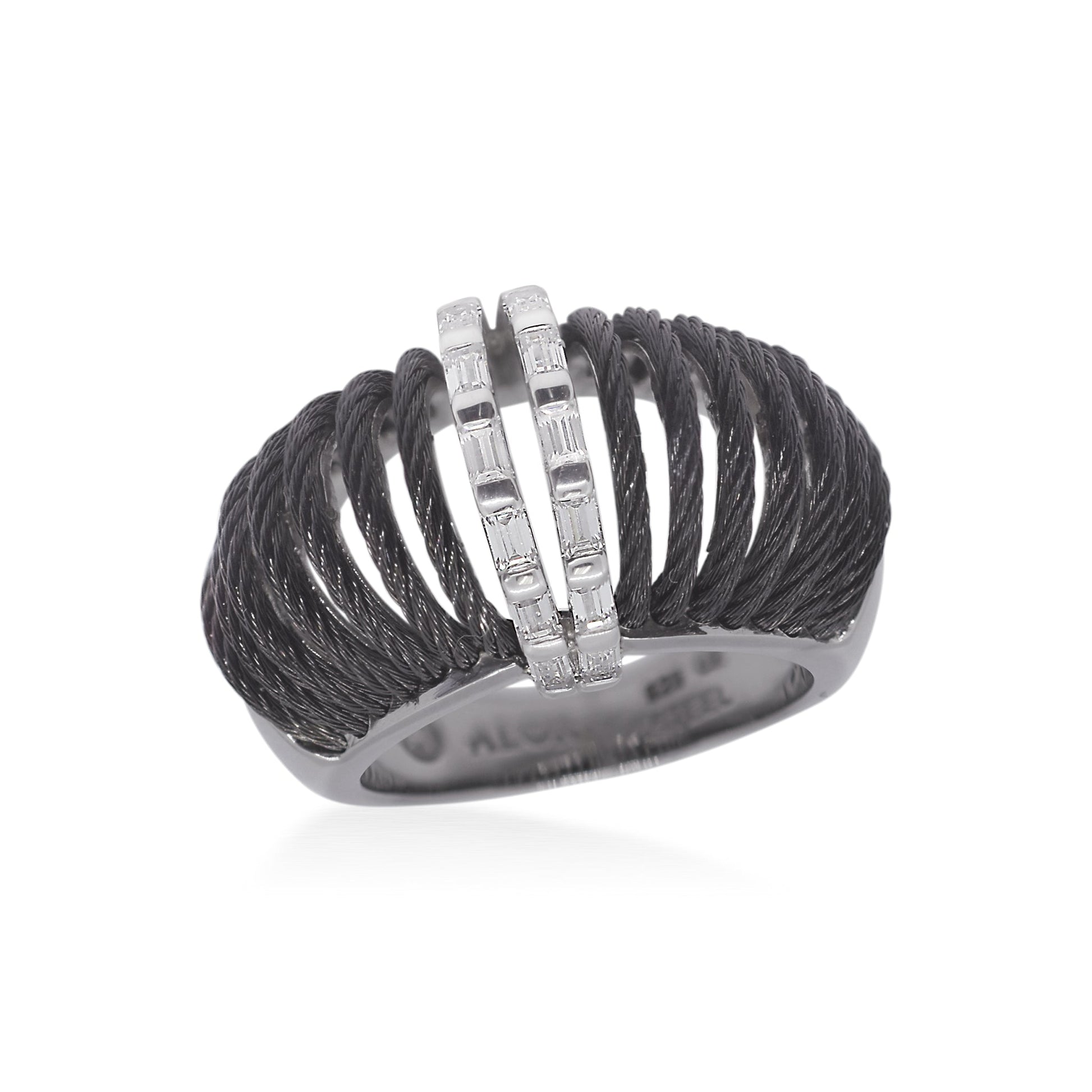 Bands of cable come together in a dimensional cage dome design with 2 rows of baguette diamonds in the center.