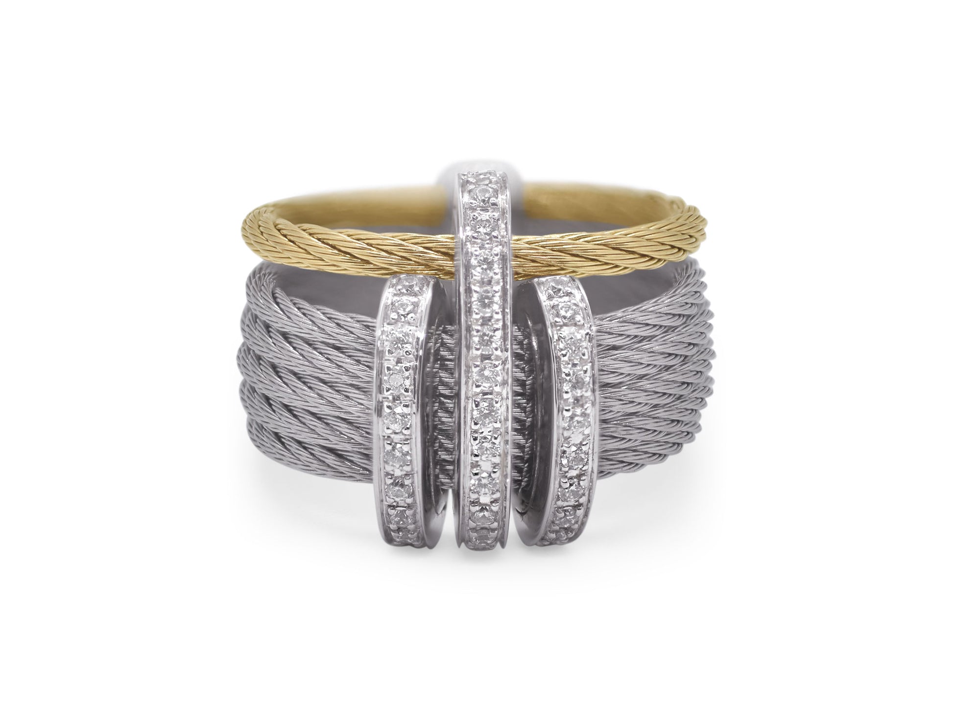 18 Karat White & Stainless Steel Grey & Yellow Cable Fashion Ring Size 7, BY ALOR 02-34-1516-11 0.27tw Round G/H In Color SI-1 In Clarity Diamonds