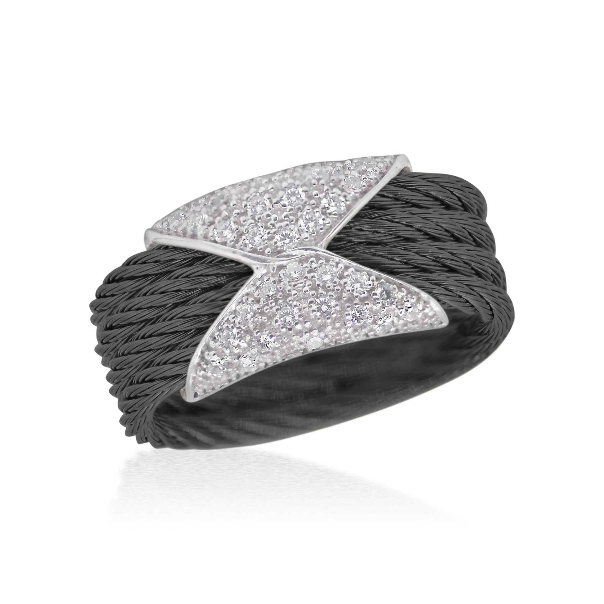 4 rows of cable are fused together with an hourglass diamond station in this wide band ring.