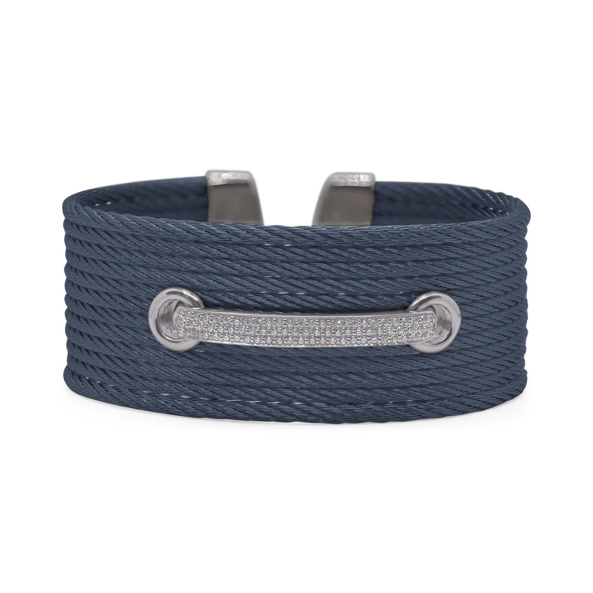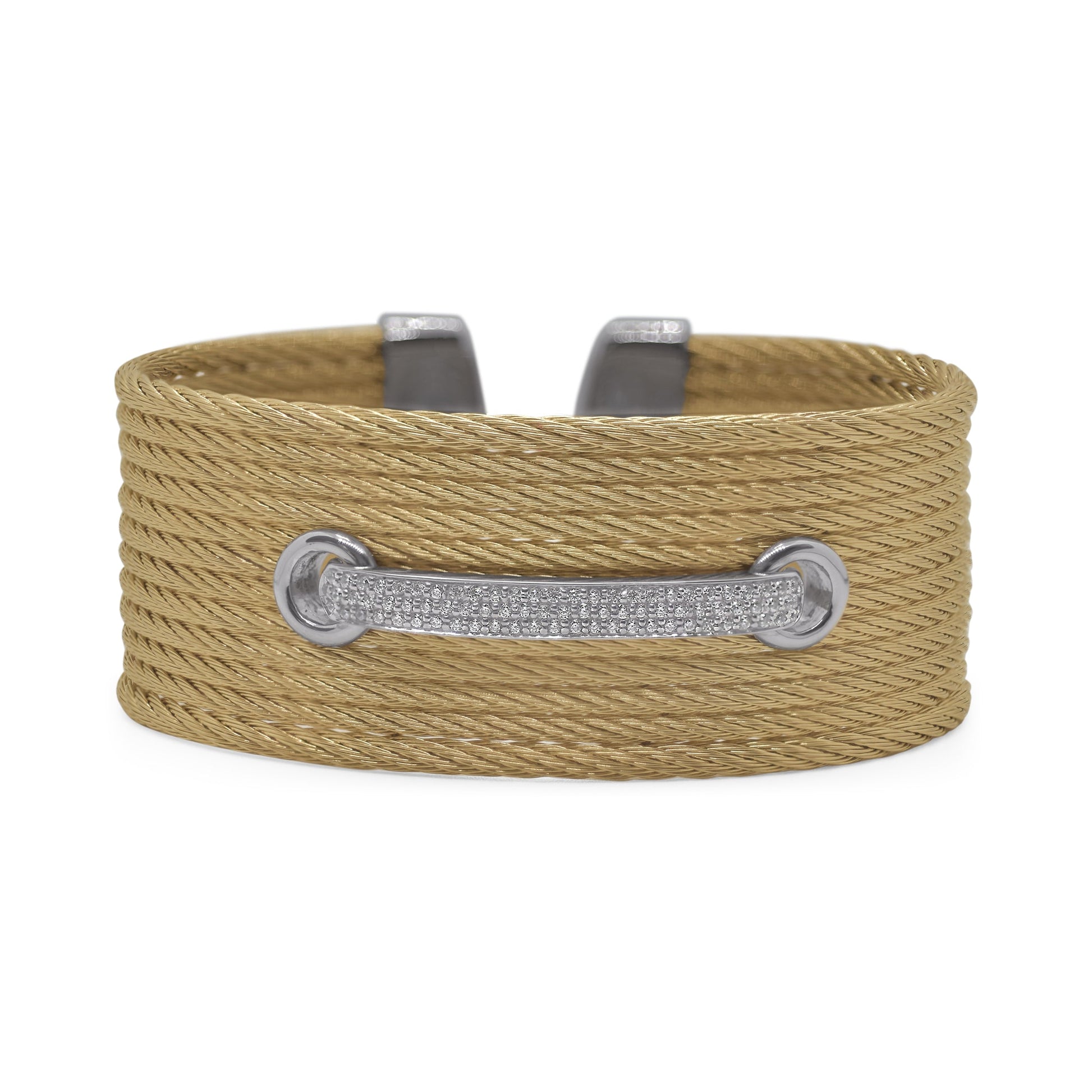 A wide statement cuff with a laced through design of diamonds.