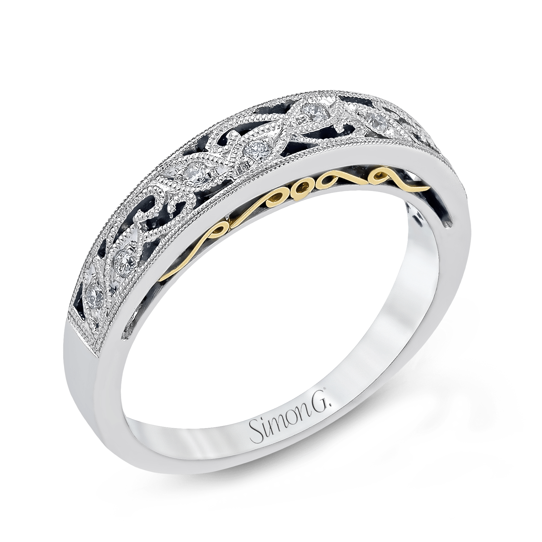 This delicate band features an intricate vintage design set with sparkling white diamonds.