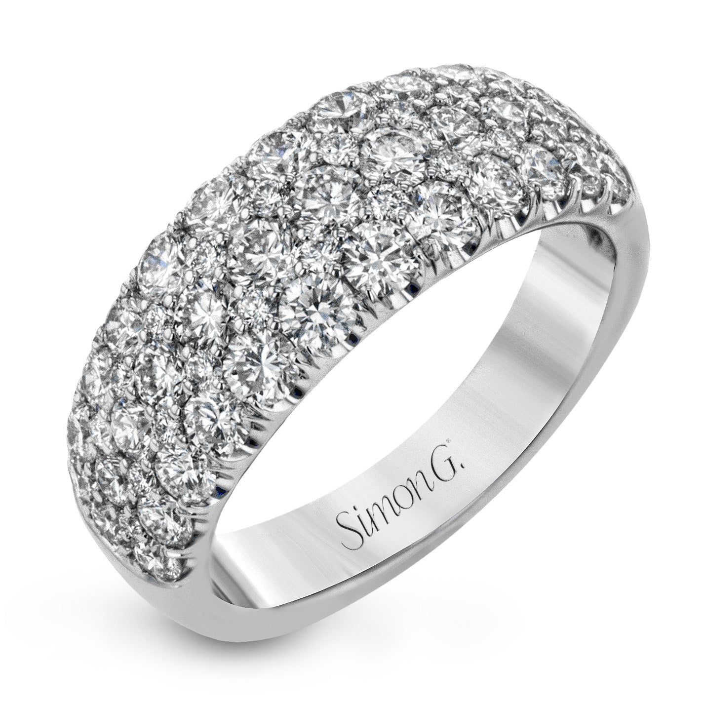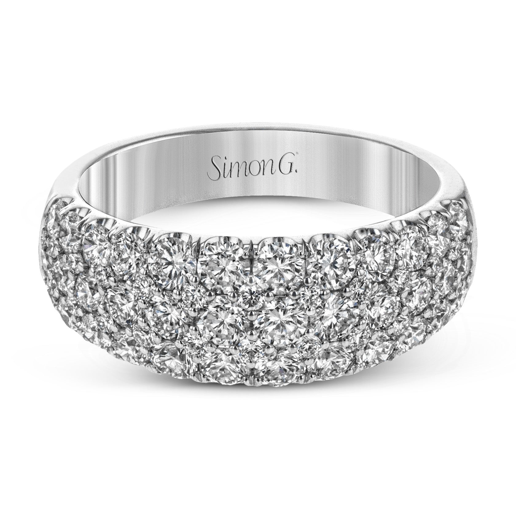 This wonderful, contemporary band glitters with a remarkable three rows of sparkling diamonds set in white or rose gold.