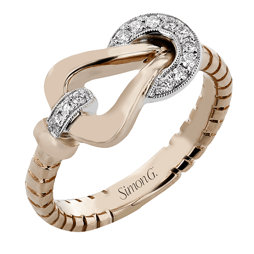 This wonderful ring features a buckle design with intricate details like milgrain on the clasp and sparkling diamonds on the collar.