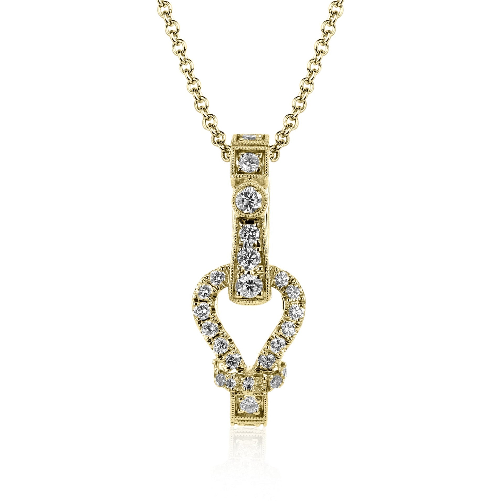 This distinctive pendant is adorned with sparkling white diamonds.