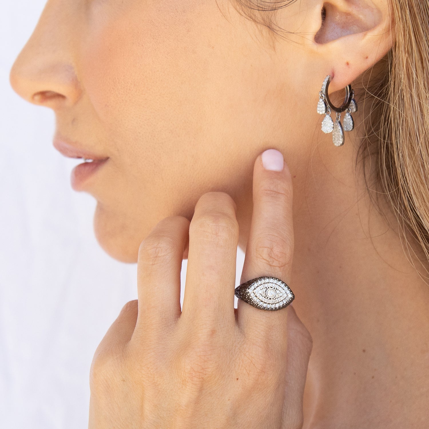Diamond shaker hoop earrings in sterling silver with five drops.