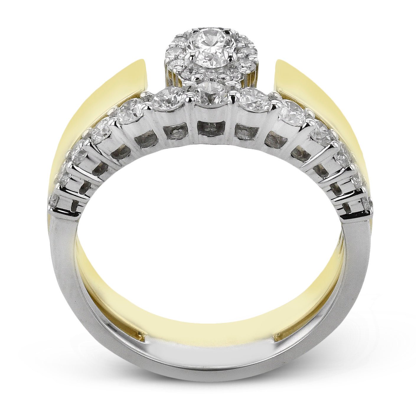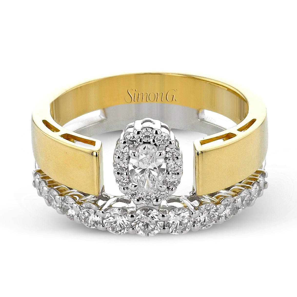 This distinctive, two-tone ring features a delightfully contrasted shank lined with sparkling diamonds as well as a sparkling oval-cut center diamondset in a halo.
