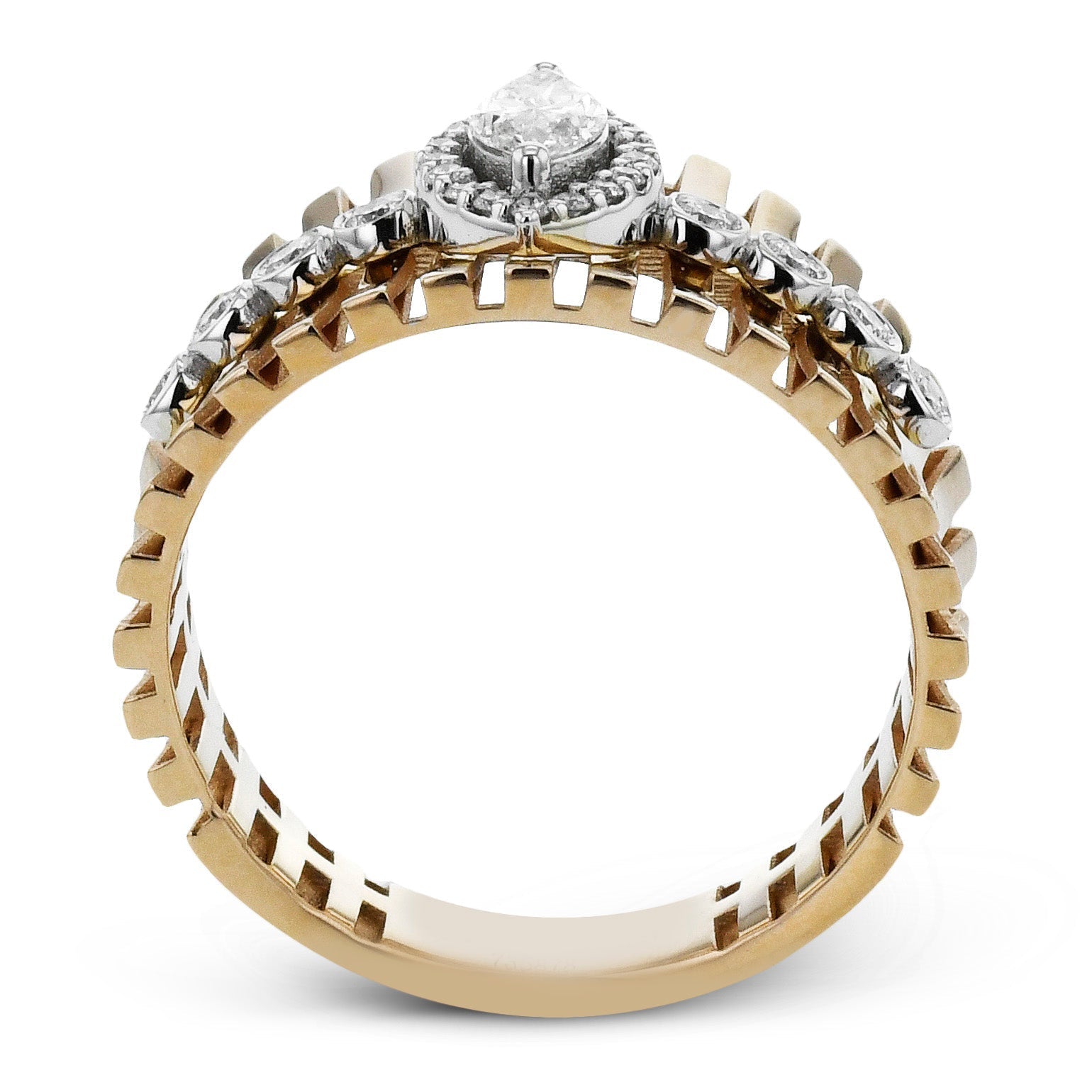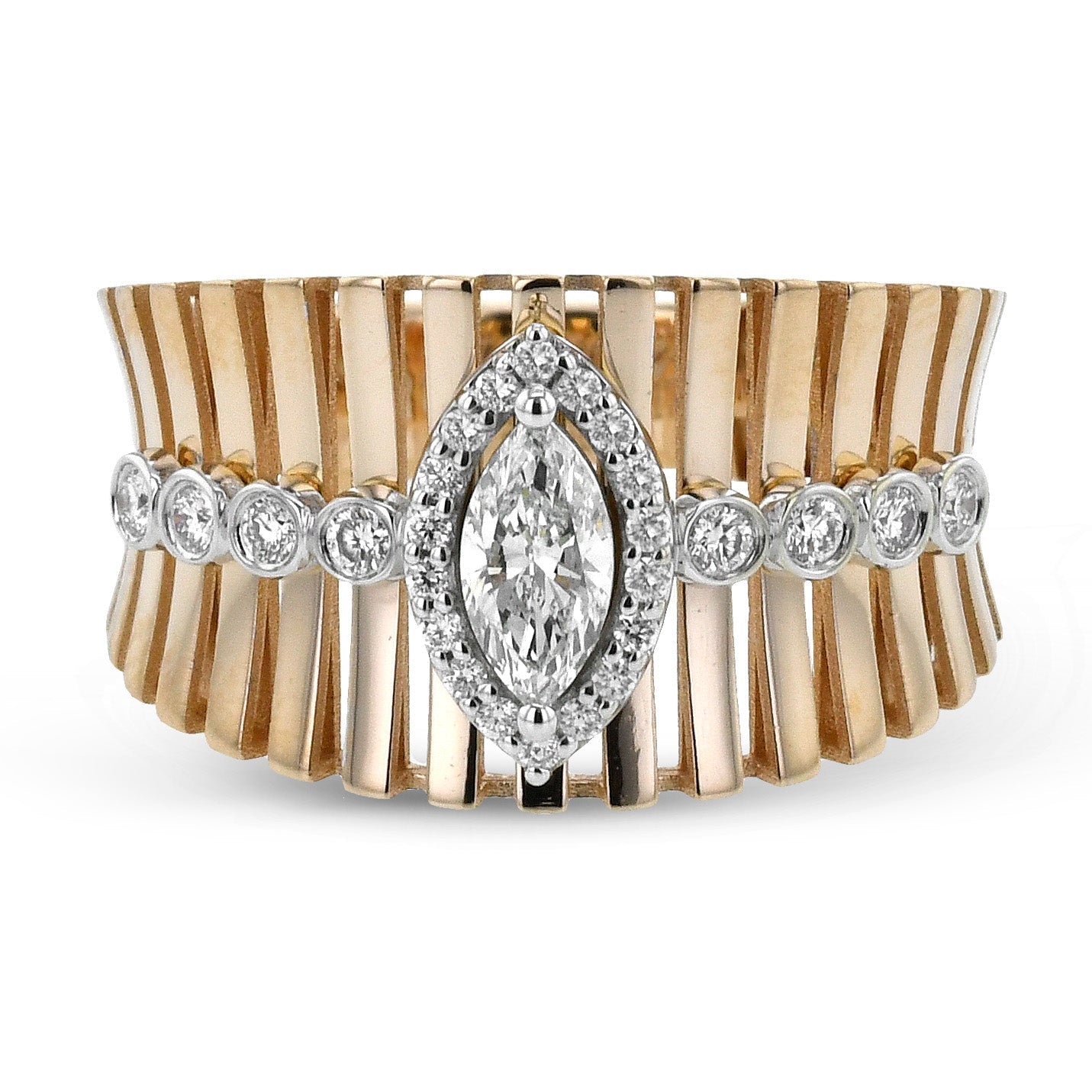 This eye-catching ring features a rose gold bars illuminated by a bezel-set diamonds leading to a sparkling diamond halo with a marquise diamond center.