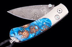 The Kestrel 'TMJ Generations' is a Timmreck & McNicol exclusive edition featuring a light and resilient frame in aerospace grade titanium, inlaid with mini pinecones in acrylic resin. The blade is hand-forged 'Boomerang' damascus by Chad Nichols; the one-hand button lock and the thumb stud are set with blue topaz gemstones. The Kestrel is a compact but versatile folder that works and presents beautifully in any situation; the design, which offers a deep finger groove at the intersection between the handle and blade, makes this knife remarkably comfortable in the hand while being very small and easy to carry.