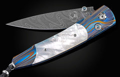 The Lancet 'Unicorn 2025' is an Exclusive Edition featuring a light and resilient 'Laser Blue' finished frame in aerospace grade titanium, and inlaid with mother of pearl. The blade is hand-forged 'Boomerang' damascus by Chad Nichols; the one-hand button lock and thumbstud are set with London Blue topaz. This Unicorn Exclusive features some of the exotic materials and hand-forged metals that are the hallmark of William Henry's collections; a distinctive personality statement to be worn and used for a lifetime.