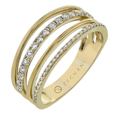 This elegant band showcases three rows of diamonds set in warm yellow gold, blending modern sophistication with timeless beauty. Its bold yet refined design makes it a perfect statement piece for everyday wear or special occasions.