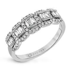 This stunning ring features a row of baguette-cut diamonds framed by intricate halos of round diamonds, all set in a polished white metal band. The geometric design and sparkling detail create a bold yet sophisticated statement piece.