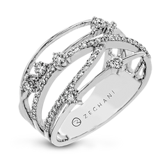 This ring features an open multi-band design with delicate pav-set diamonds and larger round stones placed along the crossing strands. Its airy, intricate style gives it a modern yet elegant sparkle.