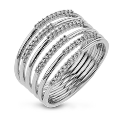 This contemporary statement ring features multiple slender white gold bands, some accented with pav-set diamonds, creating a layered, stacked look. Its bold yet refined design adds a touch of modern elegance to any ensemble.