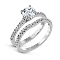 This timeless bridal set features a brilliant round-cut center diamond set on a slender pavé diamond band, offering refined sparkle and elegance. Paired with a matching pavé-set wedding band, it creates a perfectly coordinated and effortlessly sophisticated look.