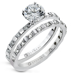 This bridal set features a stunning round center diamond paired with a matching band, both showcasing channel-set diamonds for a sleek and modern look. Clean lines and bold sparkle make it a timeless yet striking choice.