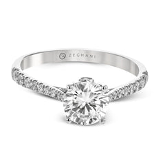 This engagement ring features a dazzling round-cut center diamond, elevated by a graceful cathedral setting for maximum brilliance. Delicate pavé diamonds line the tapered white gold band, creating a timeless and romantic silhouette from every angle.