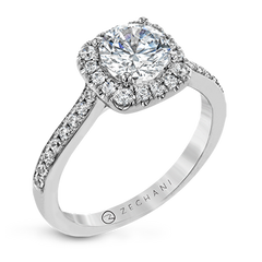 This engagement ring showcases a brilliant round center stone surrounded by a cushion-shaped halo of diamonds. Additional diamonds along the band enhance its sparkle, giving it a timeless and elegant appeal.