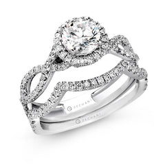 This eye-catching bridal set showcases a brilliant round-cut center diamond framed by a dazzling halo, with intertwining pavé-set bands that add dimension and sparkle. Paired with a sculpted matching band, it creates a romantic and intricately detailed look that radiates elegance from every angle.
