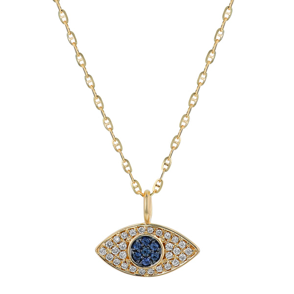 14K yellow gold EVIL EYE necklace set with 0.09 carat round brilliant diamonds and 0.04 carat blue sapphires. Chain sold separately.