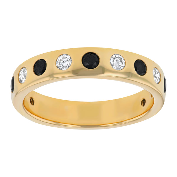 14K yellow gold semi-eternity classic band ring set with 0.70 ct. round black and white diamonds.