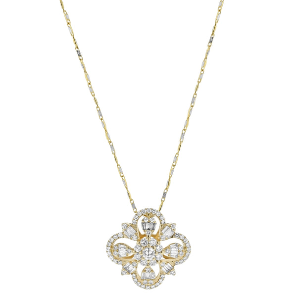 14K yellow gold clover shaped necklace set with 1.20 carats of tapered baguette and round diamonds. Chain sold separately.