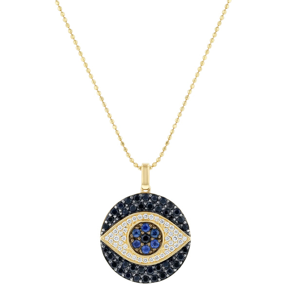 14K yellow gold EVIL EYE medallion necklace set with 0.23 carat round brilliant diamonds and 1.33 carat black and blue sapphire. The pendant is detailed with black rhodium. Chain sold separately.