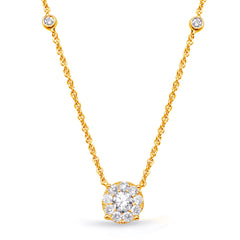This Necklace is available in 14K Yellow Gold. There are a total of 14 stones. There are Rounds with a total carat weight of 0.56 set in a Bezel Set|Micro Prong|Prong Set setting.