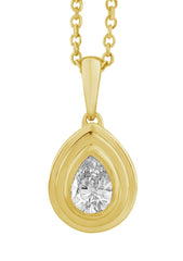 This Necklace is available in 14K Yellow Gold. There are a total of 1 stones. There are Pear Shape with a total carat weight of 0.15 set in a Bezel Set setting.