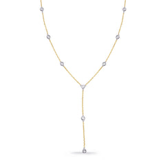 This Necklace is available in 14K Yellow & White Gold. There are a total of 9 stones. There are Rounds with a total carat weight of 0.65 set in a setting.