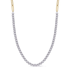 This Necklace is available in 14K Yellow & White Gold. There are a total of 51 stones. There are Rounds with a total carat weight of 2.5 set in a Prong Set setting.
