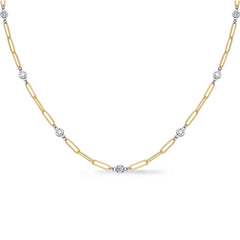 This Necklace is available in 14K Yellow & White Gold. There are a total of 12 stones. There are Rounds with a total carat weight of 1 set in a Bezel Set setting.