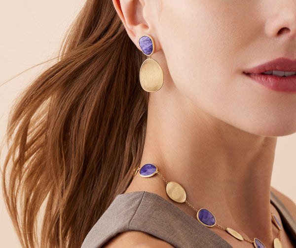 These drop earrings effortlessly combine bold volume with everyday elegance. The 18K yellow gold leaves, meticulously hand-engraved using the ancient Florentine technique, are adorned with two natural square-faceted purple charoite stones. The perfect accessory to add a pop of color to any outfit.