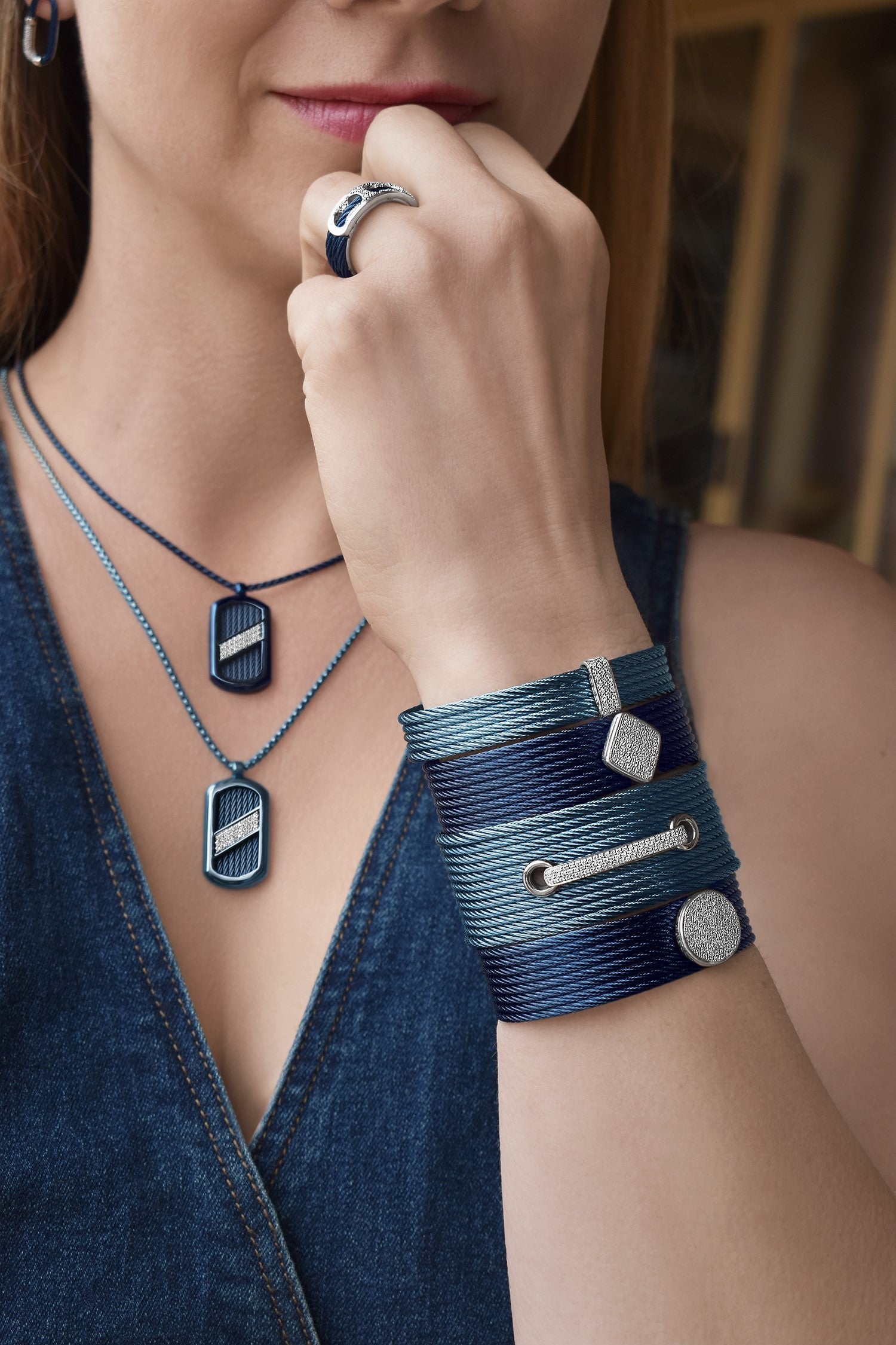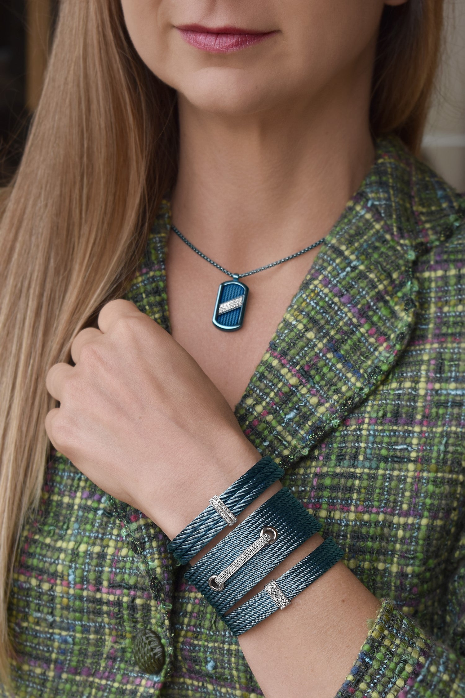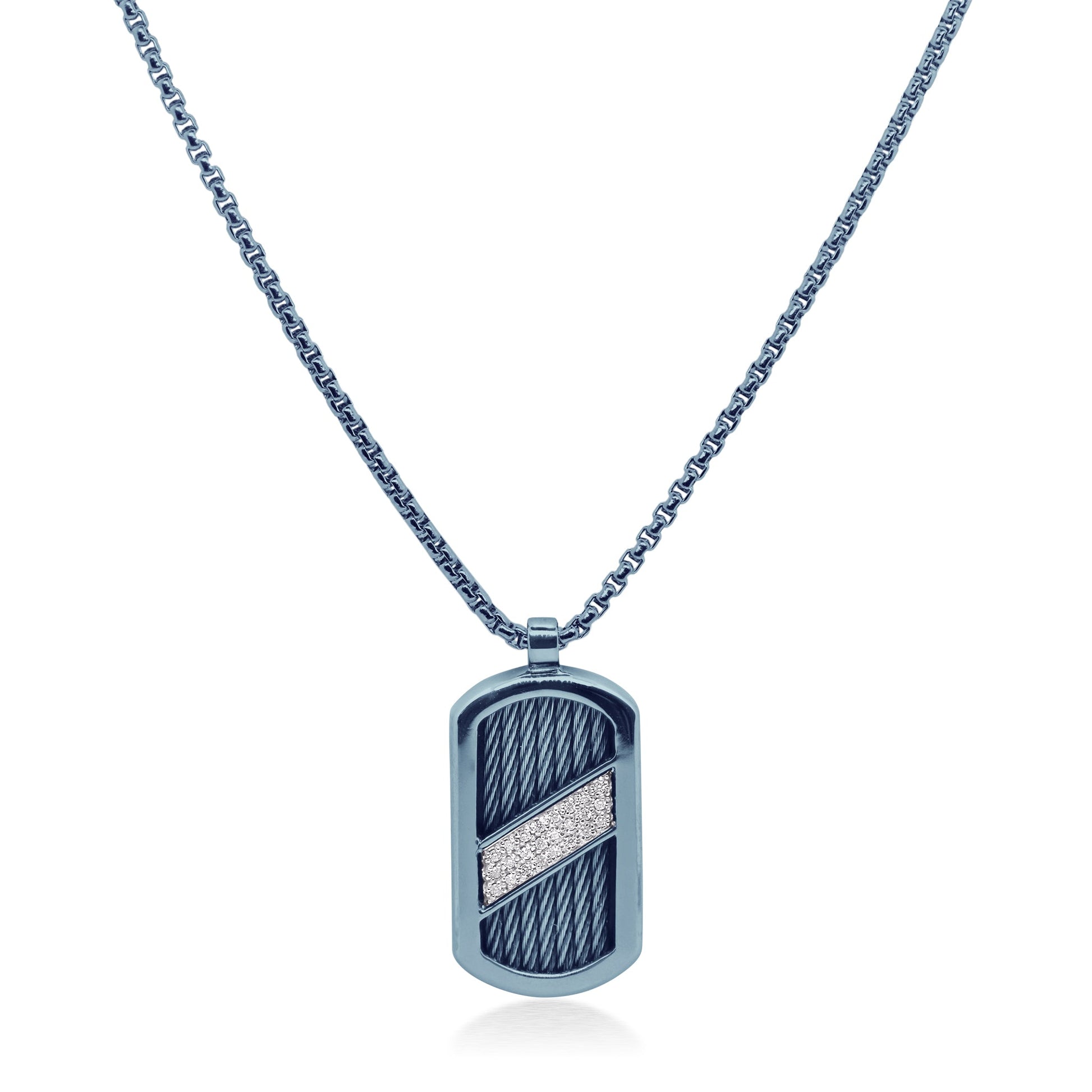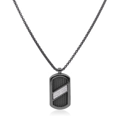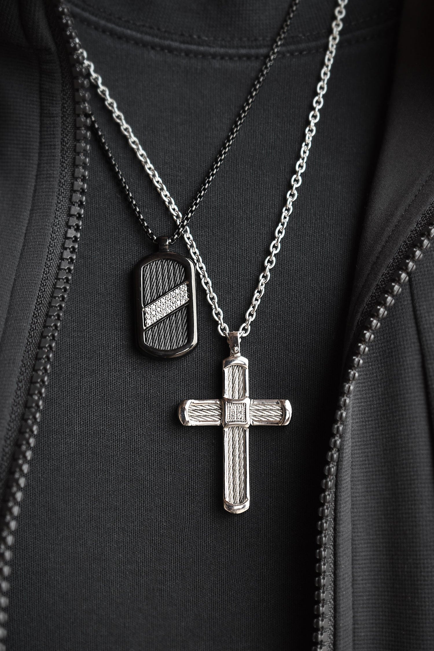 A unisex necklace with a signature cable ID tag necklace encrusted in 14kt gold & diamonds with a classic box chain necklace.