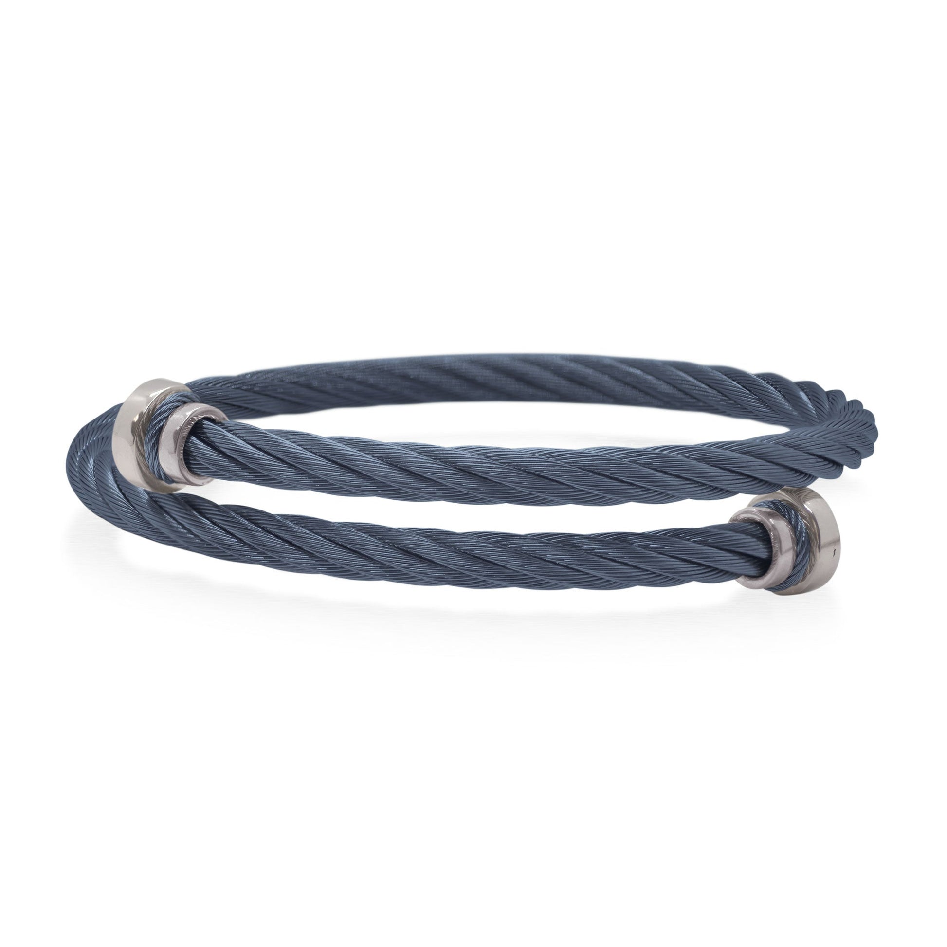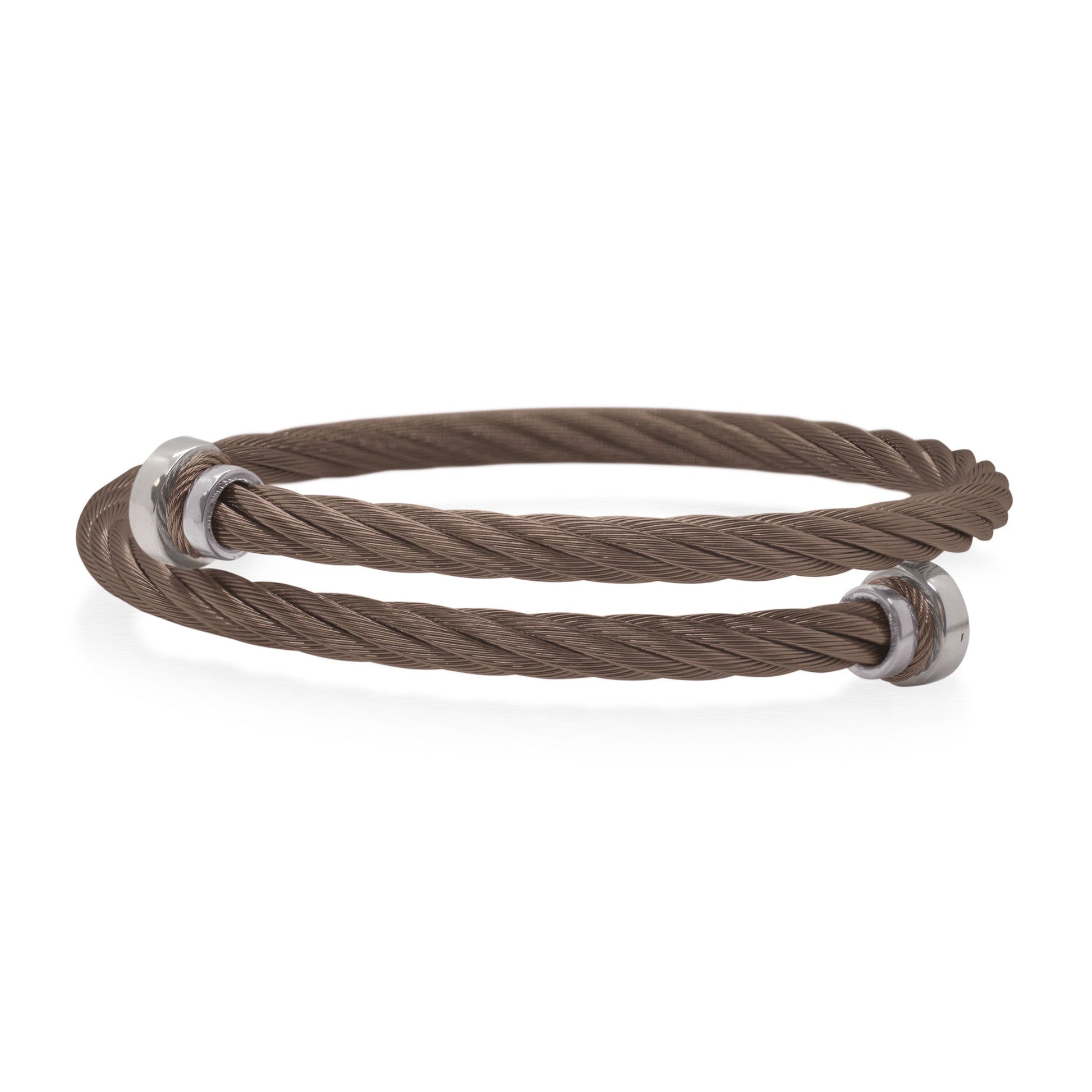 A twisted cable bypass bracelet with nail head endcaps. Imported.