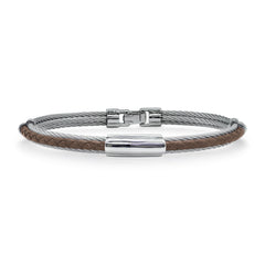 A braided leather and cable bracelet with a gold and steel center station. Imported.