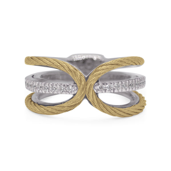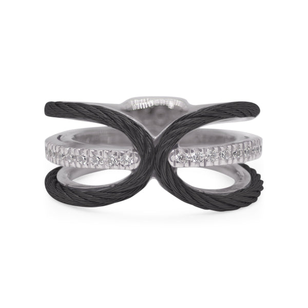 Bands of cable create a modern eternity shape with a row of diamonds in the center.