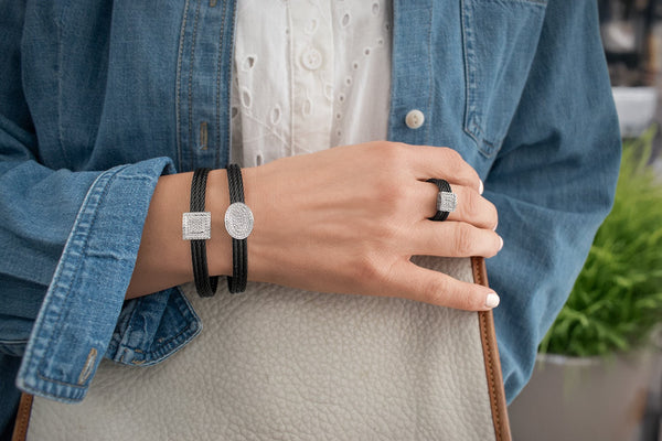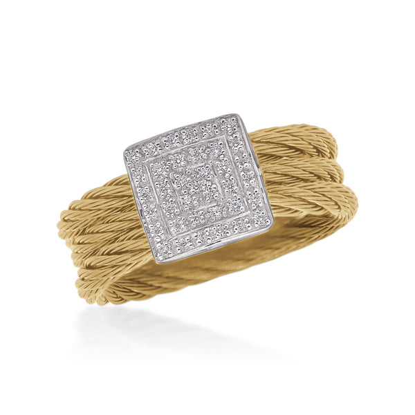 Three rows of cable are fused together with a square station of diamonds and 14kt gold.