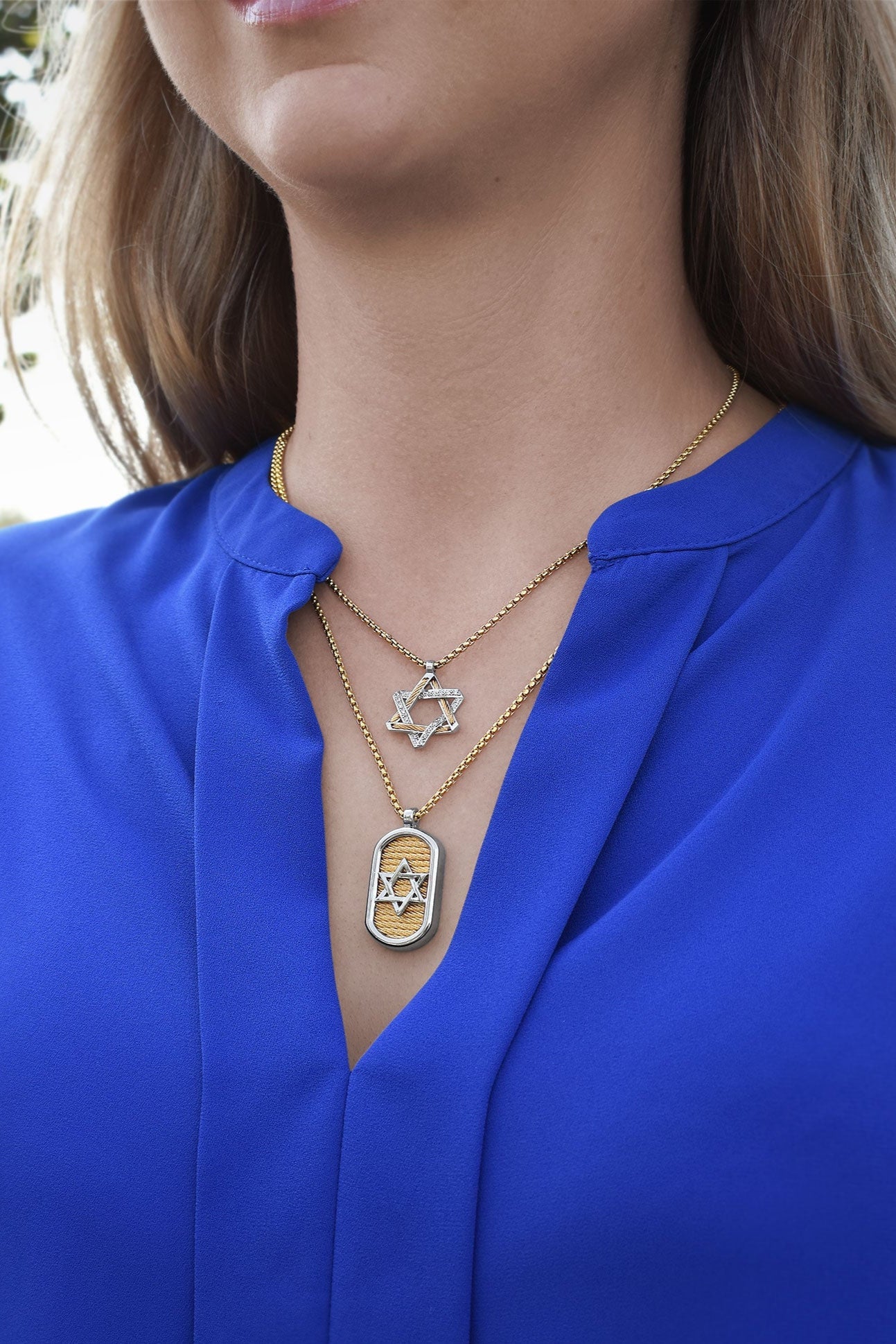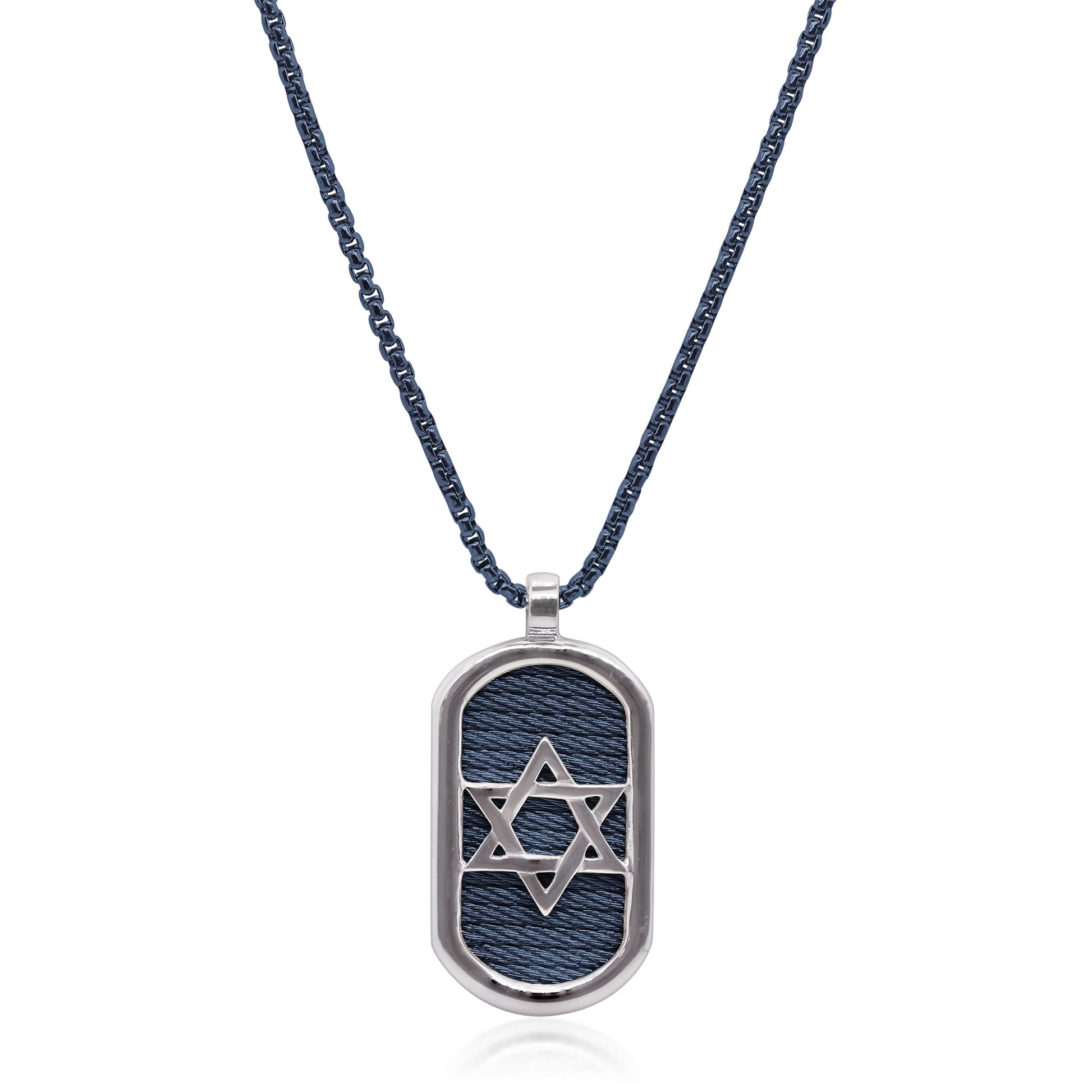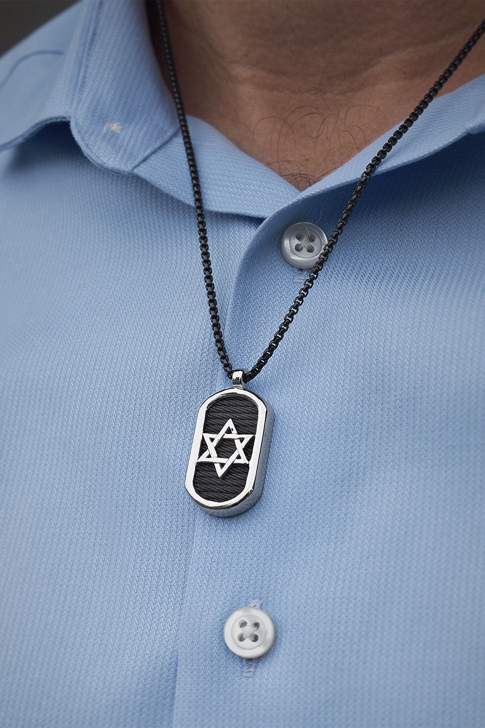 A unisex cable ID tag with a Star of David design in the center on a classic box chain necklace.