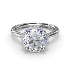 This one of a kind engagement ring features an octagon halo and peek a boo diamond for added beauty. This design can be customized based on stone shape and metal preference.