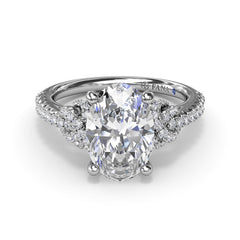 Intertwining with diamonds, this oval love knot engagement ring is flawlessly engineered to sparkle from every angle. This engagement ring can be special ordered in any finger size, in Platinum, 18KT & 14KT gold and can be customized for any shape and size centerstone.