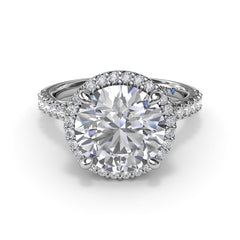 This striking and strong diamond engagement ring exalts a radiant aura of light surrounding the center stone. This design can be customized based on stone shape and metal preference.