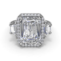 This enchanted three stone trapezoid diamond engagement ring is a guaranteed show stopper. With its diamond halo and ample side stones, this ring is unlike any other. This engagement ring can be special ordered in any finger size, in Platinum, 18KT & 14KT gold and can be customized for any shape and size centerstone.
