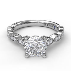 Delicate milgrain edges turns this delicate engagement ring into something truly special. A classic band with milgrain detailing brings out old-world beauty and romance. This round cut engagement ring can be special ordered in any finger size, in Platinum, 18KT & 14KT gold and can be customized for any shape and size centerstone.