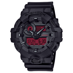Go bold, tough, and intense, with the G-SHOCK black and red collection. The vibrant, high saturation red of the LCD really pops against the black bezel, band, and dial, not only enhancing visibility but also pushing the envelope of daring design. Activate the backlight to light up the digital display for even better visibility. Make a unique statement in all black, with a touch of bold red.
